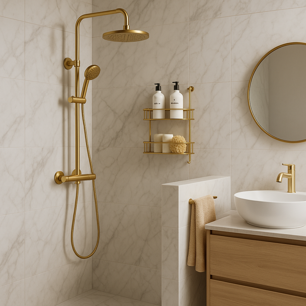 Apportez une touche d’élégance et de raffinement à votre salle de bain avec la colonne de douche murale dorée avec mitigeur thermostatique et ciel de pluie. Son mitigeur thermostatique assure une température constante et sécurisée, tandis que la large tête pluie murale diffuse un jet enveloppant et relaxant, digne d’un spa. Grâce à sa finition dorée haut de gamme et à son design contemporain, cette colonne combine style, confort et durabilité, transformant chaque douche en véritable moment de bien-être.