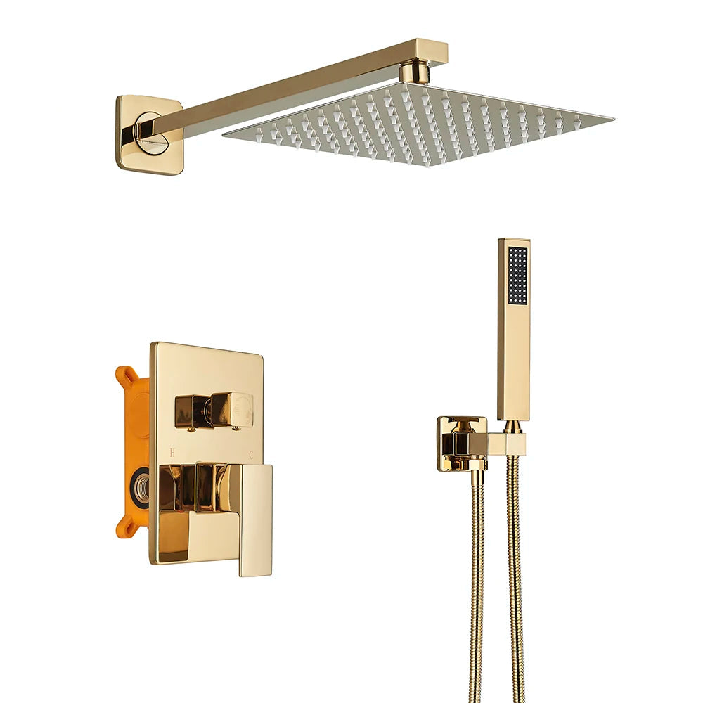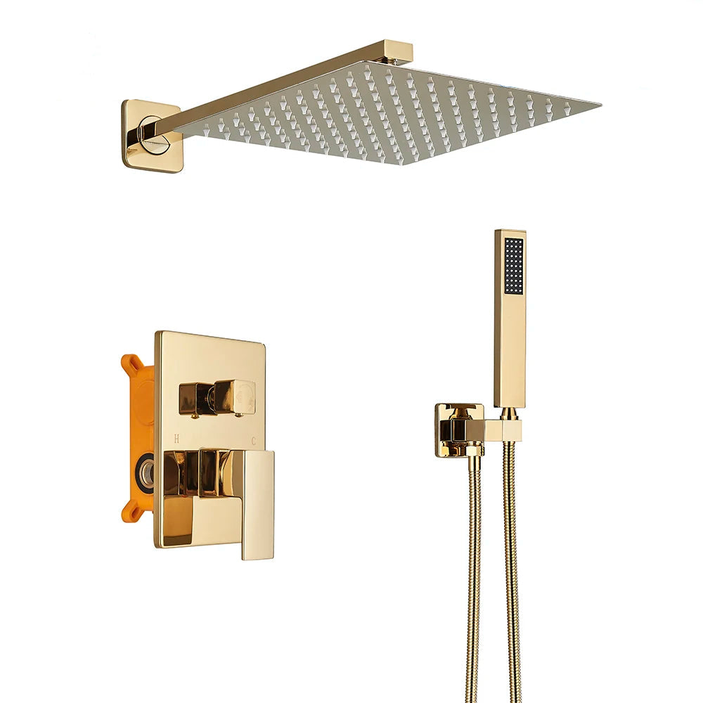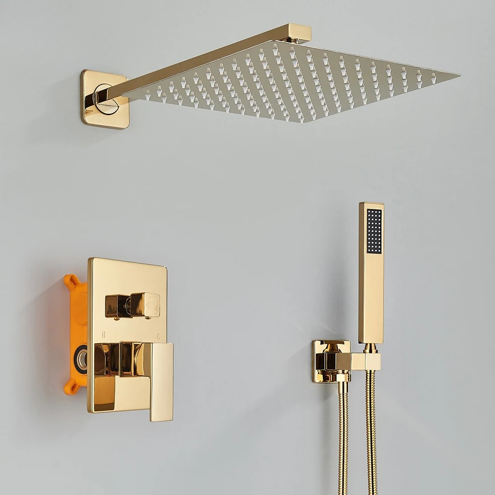 Colonne de Douche Encastrable Doré Mitigeur Encastré 2 Voies, Design Contemporain, Pomme Murale & Douchette en Laiton