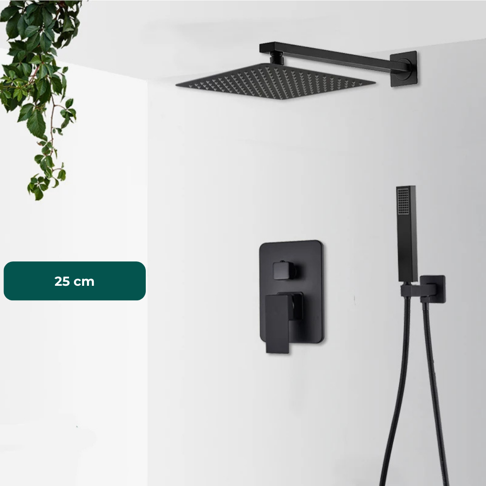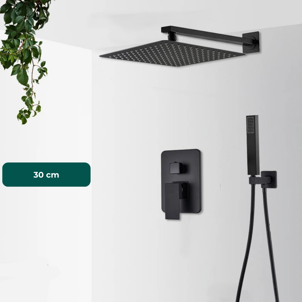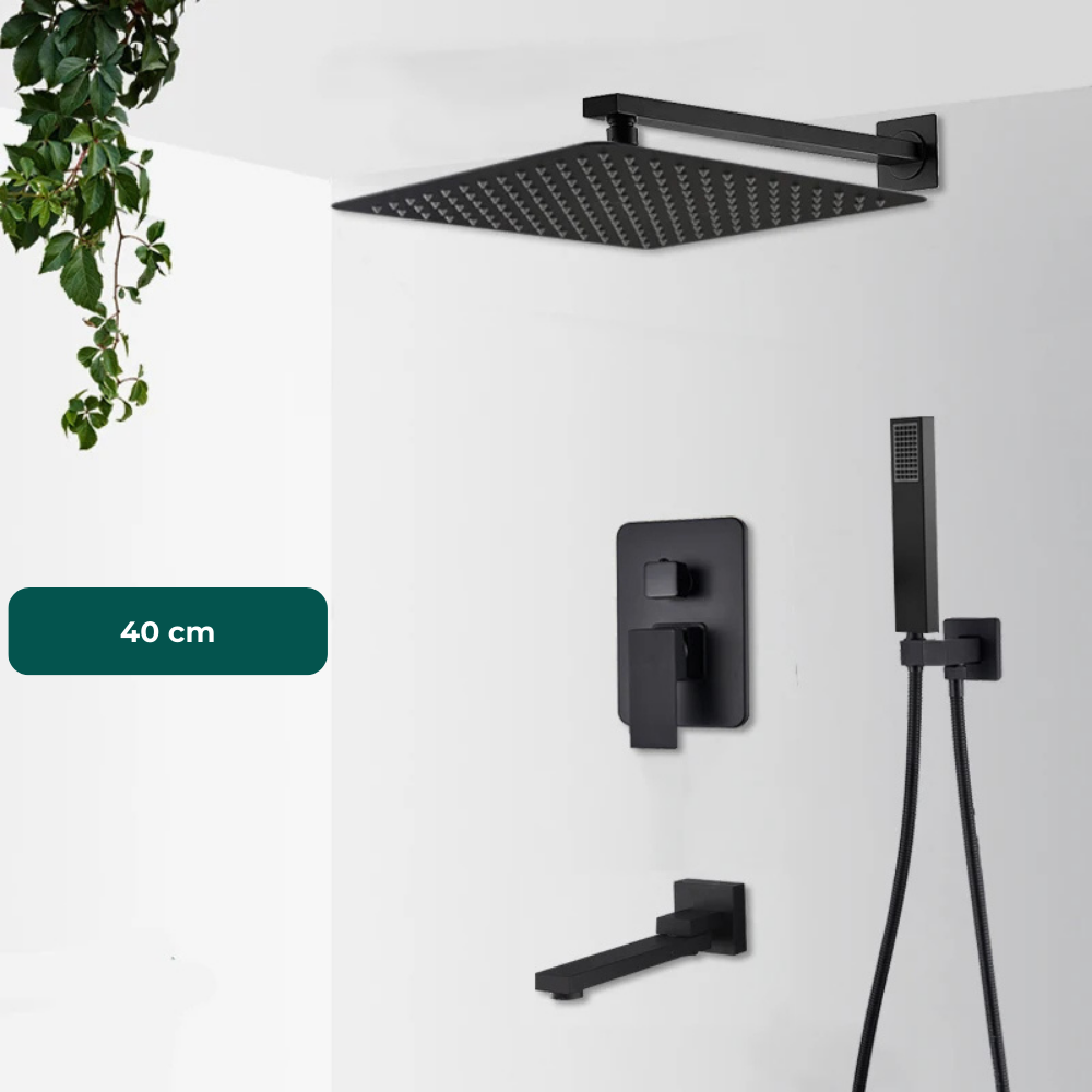 • Dimensions: SYSTÈME PRINCIPAL: 42 cm (H) | 28 cm (L) | 8 cm (P) | Laiton noirci, COMPOSANTS PRINCIPAUX: TÊTE DE PLUIE CASCADE: 30/40 cm (largeur) | 6 cm (hauteur chute) | Débit 12 L/min, DOUCHETTE À MAIN: 18 cm × 10 cm | Laiton noirci | Design ergonomique, BEC DE BAIGNOIRE: 15 cm (longueur) | Laiton noirci | Rotation 90°, COMMANDE UNIQUE: Poignée unique | Double contrôle eau | Cartouche céramique, RACCORDEMENTS: 15 cm (entre entrées) | Standard européen | Encastré mur, INSTALLATION: 35 cm × 45 cm (espace mural requis) | 4 points fixation encastrée