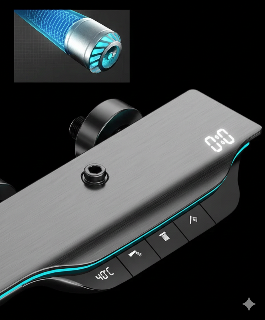 Ce système de douche thermostatique numérique est conçu pour offrir une expérience de douche puissante, confortable et intuitive. L’affichage numérique en temps réel permet d’ajuster rapidement la température idéale, tandis que le système d’alimentation hydroélectrique génère l’énergie nécessaire au fonctionnement sans batterie ni alimentation externe.