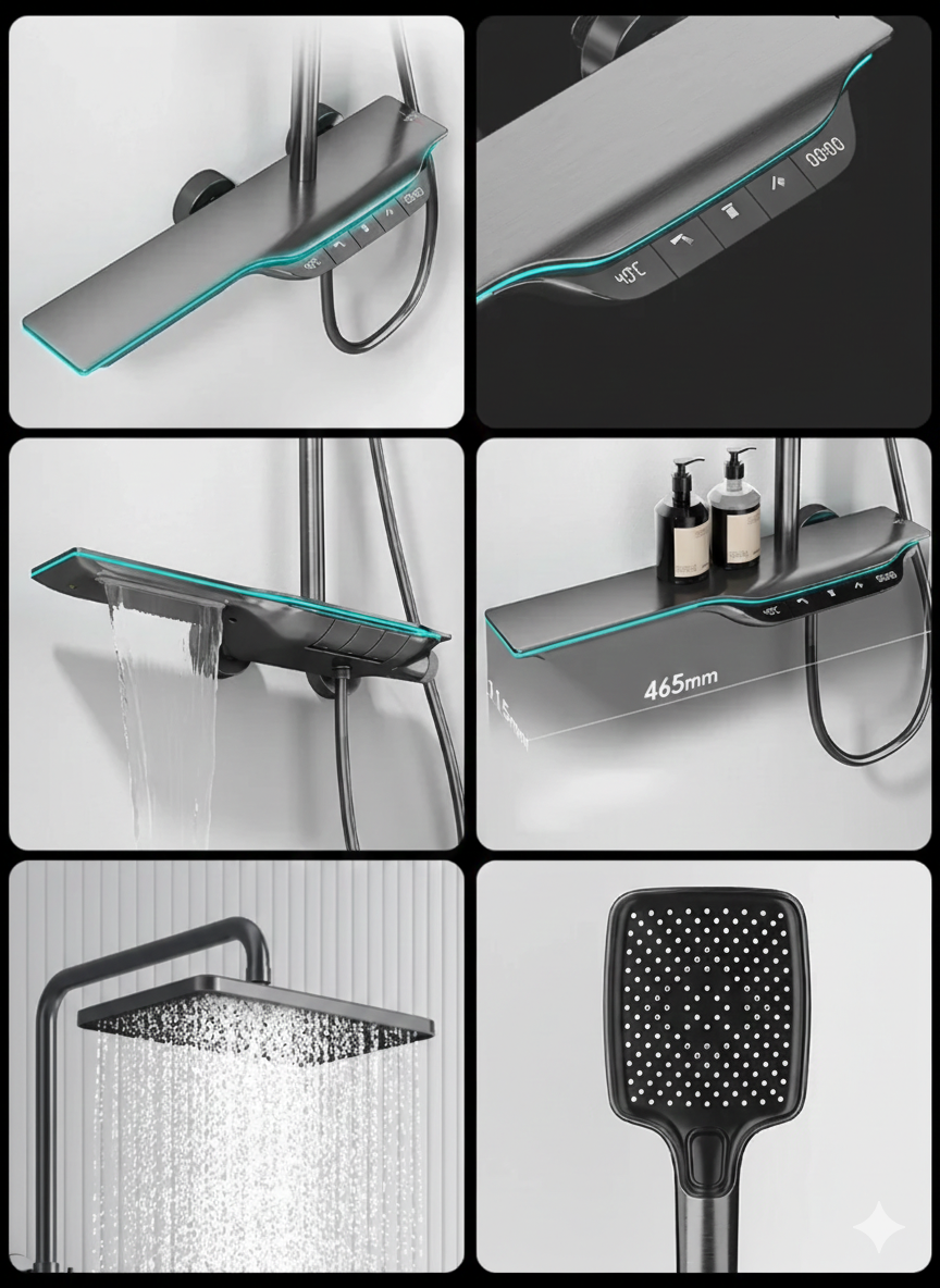 Profitez d’une expérience de douche complète et confortable grâce à ce système de douche thermostatique numérique, conçu pour offrir un contrôle précis de la température, des fonctions polyvalentes et un design moderne adapté à toute la famille.