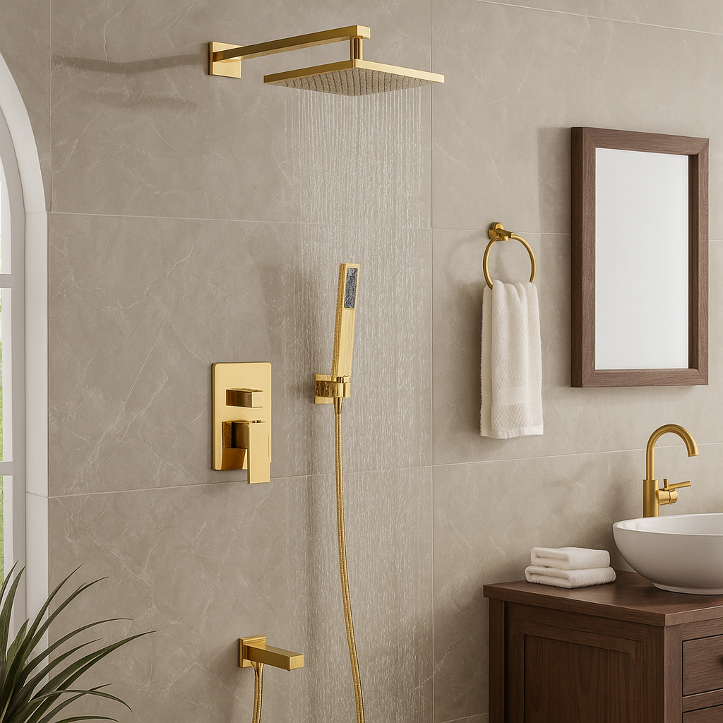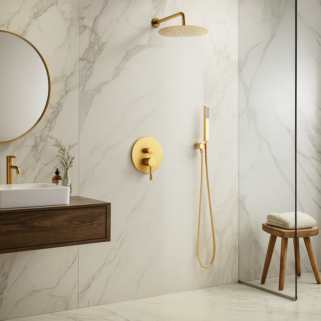Colonne de Douche Doré - Cascade & Pluie de Luxe, Mitigeur Mural Moderne avec Douchette à Main