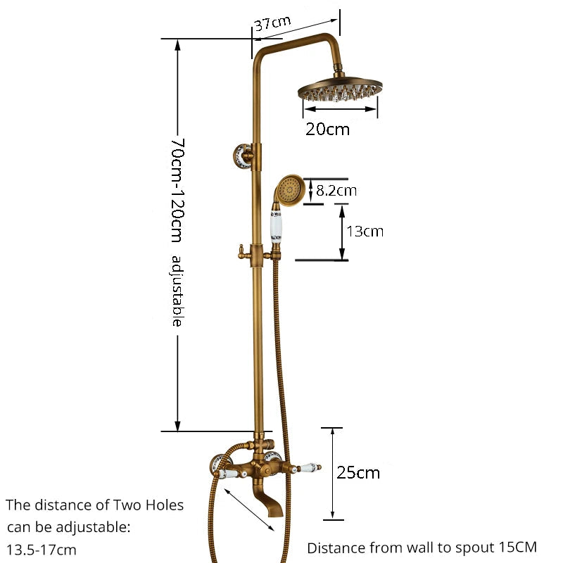 Apportez charme et authenticité à votre salle de bain avec la colonne de douche antique avec mitigeur en laiton et étagère. Conçue en laiton massif, elle assure robustesse et longévité, tandis que son mitigeur thermostatique maintient une température stable et sécurisée. La large pomme pluie offre un jet doux et relaxant, et l’étagère intégrée apporte praticité pour ranger vos essentiels. Avec son style rétro raffiné et sa finition élégante, cette colonne combine design intemporel, confort et fiabilité, transformant chaque douche en un moment de bien-être.